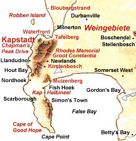 Kapstadt - die City ist eine moderne Großstadt mit zahlreichen Wolkenkratzern und Geschäftshäusern. Vom Signal Hill aus hat man den besten Überblick über City, Tafelberg, die Bucht mit Robben Island und den Hafen. Der Ausblick ist wirklich genial und abends treten sich hier die Touristen gegenseitig auf die Füße, weil Kapstadt bei Nacht und mit Lichterglanz noch schöner aussehen soll als tagsüber. Mangels Zeit haben wir das nicht nachprüfen können. Wir machen einen Spaziergang durch die City mit reichlich Shopping-Möglichkeiten, verfehlen das Internet-Café nur um zwei Querstraßen, kommen schließlich zum Hafen, wo mit der Victoria & Alfred - Waterfront ein modernes Einkaufs- und Amüsier-viertel in teilweise alten Lagerhallen sowie topmodernen Neubauten entstanden ist. Hier gibt es so ziemlich alles zu kaufen, Restaurants für jede Geschmacksrichtung und vor allem eine herrliche Aussicht auf den Tafelberg, eingerahmt von Devils Peak und Lions Head. Oftmals ist die scharfe Gipfelkante des Tafelsberges verhüllt vom sogenannten Tischtuch, einer flachen Wolke über dem Berg. Das Hinterland von Kapstadt im Radius von einigen 100 km wird bestimmt durch den Weinanbau. Franschhoek, die Franzosen-Ecke, heißt ein kleiner, hugenottisch geprägter Ort, eines der Weinbauzentren der Gegend. Hier reihen sich Weingut an Weingut, wobei es sich teilweise um historische und sehr sehenswerte Gebäude handelt. Eine Weinprobe haben wir leider nicht mitgemacht, jedoch kann ich von zahlreichen „Eigenversuchen" sagen, dass die Südafrikaner viele hervorragende Weine hervorbringen! - Landschaftlich ist die Weingegend ziemlich bergig und auf unserem Ausflug haben wir immerhin vier Pässe überquert. Es gäbe noch so viel über das Kap zu berichten und wir haben längst nicht alles gesehen. Uns drängte unser Zeitplan weiter zum Kap Agulhas, dem tatsächlich südlichsten Punkt des Kontinents, wo die Wellen ganz unspektakulär gegen die Felsen plätschern. Ein Schild und eine Gedenktafel markieren den geografisch bedeutenden Punkt. Die Gartenroute nennt sich der Abschnitt der Küste zwischen Agulhas und Port Elisabeth sowie weiter östlich. Erster Ort, der von uns besucht wird, ist Mosselbay. Hier wohnen wir im Old Post Office Tree Guest House, benannt nach dem Baum, unter dem Matrosen in früheren Jahren ihre Post deponierten, die dann andere Seereisende in die gewünschte Richtung transportierten. Heute erinnert ein kleines Steinmonument an dieses erste „Postoffice" in Südafrika. Leider war das Wetter alles andere als schön und vor einem Regenschauer rette ich mich ins benachbarte Muschelmuseum. Bevor wir uns der weiteren Gartenroute intensiver widmen, machen wir einen Abstecher ins Landesinnere nach Prince Albert. Auf dem Weg dorthin kommen wir durch Oudtshoorn, welches Zentrum der südafrikanischen Straußenzucht ist. Überall auf dem Lande werden diese lustigen Vögel gezüchtet. Auch hier ist das Wetter recht regnerisch, und mit leichtem Umbehagen nähern wir uns den wolkenverhangenen Bergen, über die der Swartbergpass nach Prince Albert führt. Trotz Wolken immer noch ein bißchen Sicht in die Täler, doch dann die Überraschung: Schnee! Die Passhöhe bei 1582 m ist richtig verschneit und die Straße, ein einspuriger Schotterweg, ebenfalls. Das ist dann doch recht unangenehm, mit dem Mietwagen mit Sommerreifen bergab zu rutschen, ohne Leitplanken und den Abgrund vor Augen..... Doch endlich liegt auch das hinter uns und den Rest der Paßstraße können wir wieder richtig genießen, zumal auch das Wetter besser wird. Prince Albert selber ist ein verschlafenes Dort mit einem 150 Jahre alten Hotel, sehr plüschig ausgestattet, sowie einer Post, einer Kirche und einem Museum. Sonntag Abend ist hier absolut gar nichts los! Ganz anders am nächsten Tag Knysna, wo wir nach der Fahrt durchs Gebirge (diesmal aber nicht über den verschneiten Paß, sondern durch den Meiringspoort) glücklich wieder auf die Küste stossen. Eine nette kleine, aber geschäftige Stadt an einer großen Lagune, die durch eine Meerenge gespeist wird. Über Nacht sind wir in Wilderness im Karos Wilderness Hotel untergebracht. Ein sehr gutes Hotel mit sehr gutem Restaurant: Abendessen und Frühstück vom Riesen-Buffet, das keine Wünsche offen läßt! - Auch Wilderness liegt an einer Lagune, an der man auf einem Pfahlweg entlang wandern kann. Mit etwas Glück lassen sich verschiedene Wasservögel entdecken. Im Tsitsikamma Forest Nationalpark, dem ein kurzer Besuch am nächsten Tag gilt, kann man richtig durch Urwald wandern. Höhepunkt des Spazierganges ist ein schlicht „Big Tree" genannter Baumriese. Dann übernachten wir noch in Jeffreysbay im Savoy Protea Hotel, das so unscheinbar ist, dass wir zunächst einmal dran vorbei fahren, ohne es überhaupt zu bemerken. Auch sonst ist diese Etappe nicht unbedingt erwähnenswert. In die Wildnis Nun verlassen wir für ein paar Tage die Zivilisation und tauchen ein in die Tierwelt Südafrikas. Im Addo Elephanten Park hoffen wir, die dort ansässigen ca. 200 grauen Riesen zu Gesicht zu bekommen. Auf einer ersten Pirschfahrt am Nachmittag sehen wir allerdings nur einen einzigen Einzelgänger. Ansonsten gibt es hier verschiedene Antilopenarten, Warzenschweine, Nashörner, zahlreiche Vögel und haufenweise Mistkäfer, die etwa 5-Markstück-groß sind und ihre Eier in eine Kugel aus Elefantendung ablegen, die sie dann im Rückwärtsgang durch die Gegend kullern. Dies ist Aufgabe der Männchen, die Weibchen laufen nebenher und beschränken sich darauf, gute Ratschläge zu geben... das kennen wir doch irgendwoher??? Das Essen in diesen staatlichen geführten Park-Restaurants ist immer noch so miserabel, dass die Reisenden mit Sehnsucht und Magenknurren an die hinter ihnen liegenden Hotels denken. - Wo sind nun aber die restlichen 199 Elefanten? Dies versuchen wir, bei einer weiteren Pirschfahrt herauszufinden und tatsächlich zeigt sich uns eine Herde von etwa 30 Tieren in der Ferne. N