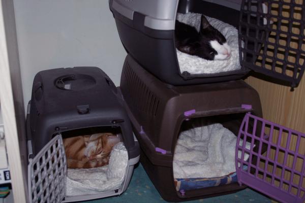 Unter meinem Schreibtisch im Fußraum stehen die drei Kennels ... und mind. einer ist jeden Abend belegt, oft auch zwei ... sozusagen Etagenwohnungen für Katzen