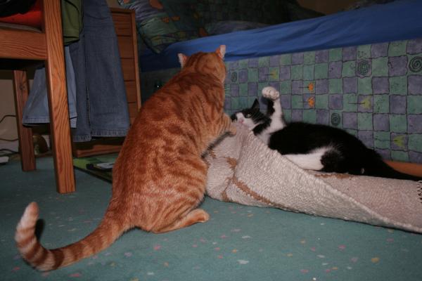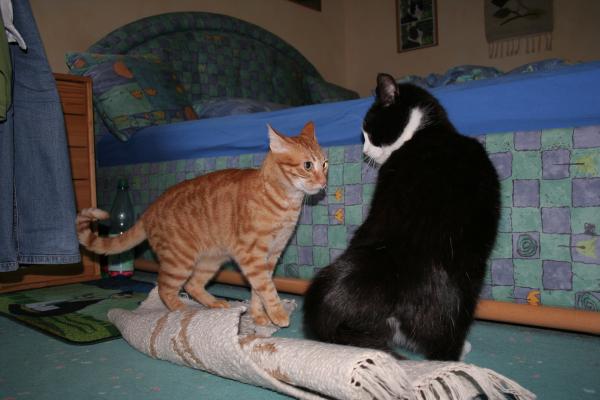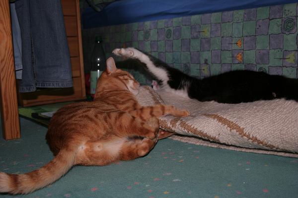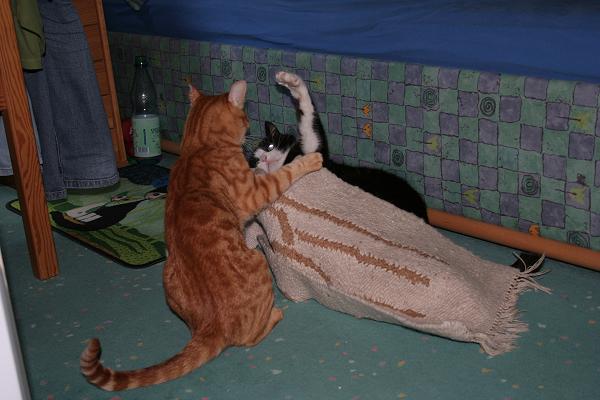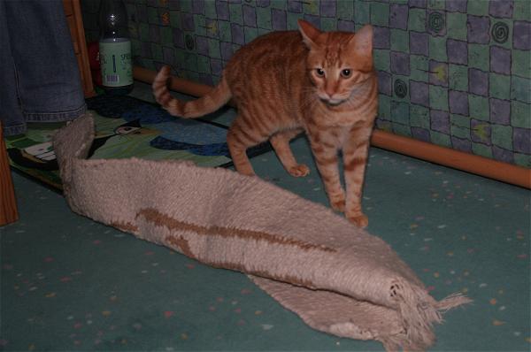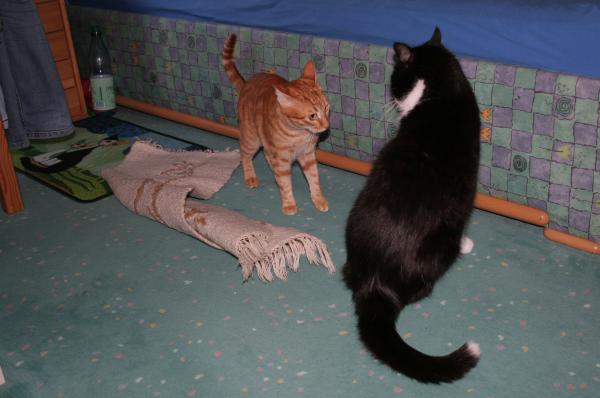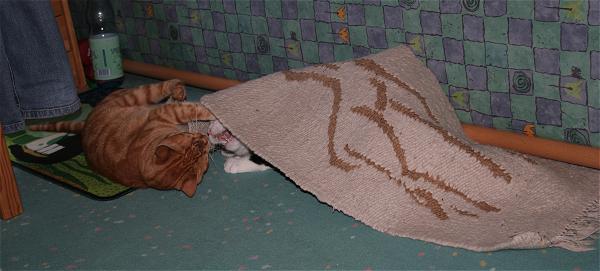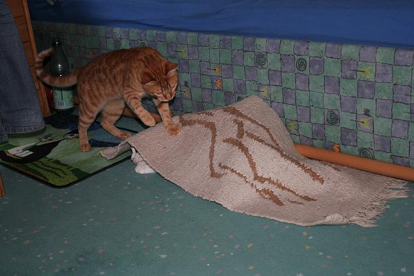 Was ist das???? ![]() Das muss untersucht werden! ![]() Mist - ertappt ![]() ![]() Ha ... das ist was zum Spiiiiielen!! ![]() *dapp* Eins uffs Dach, juchee!! ![]() Du Nervzwerg! ![]() ![]() ![]() ![]() Großer, was willst Du, hm?? Das is MEIN Teppich!!