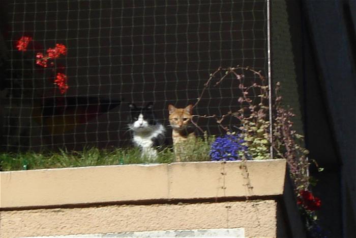 ... wenn man nach Hause kommt und schon sehnsüchtig erwartet wird! Oft, sehr oft sitzt Paulchen nachmittags auf dem Balkon und guckt, ob ich komme - entweder mit dem Fahrrad oder mit dem Auto, so wie heute. Dann wartet er, bis ich ihn von unten her begrüßt hab und in Richtung Haustüre gehe, und flitzt seinerseits zur Wohnungstür. Heute saßen beide Kater draußen: ![]() Das find ich soooo süß , und so macht das Nach-Hause-Kommen doch gleich