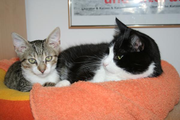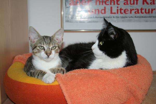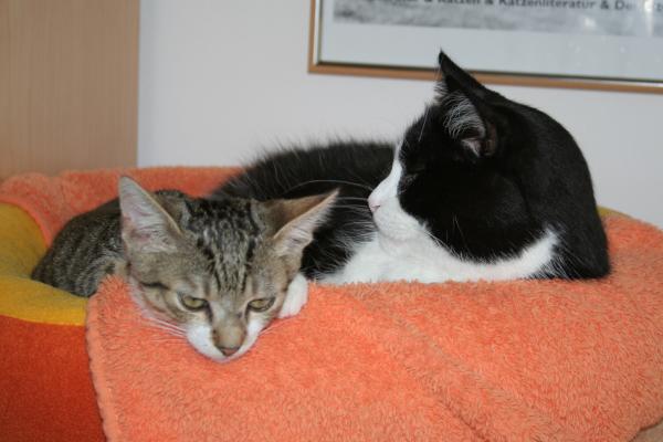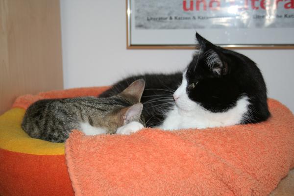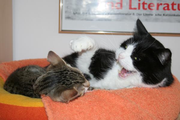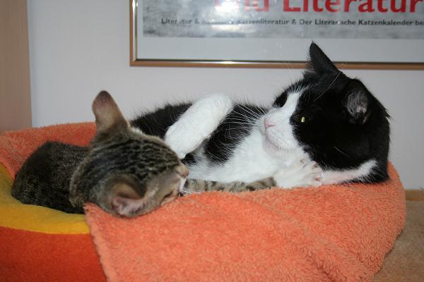 Meouw, hier ist der Paul! Oberplüscheli einer vierköpfigen Fellfusselbande und als solcher sozusagen Erziehungsberechtigter ![]() Also, da hat uns Frauchen ja neulich so einen kleinen frechen Floh angeschleppt .... alles wurde hier erstmal auf den Kopf gestellt, als der hier einzog! Und frech ist der ... nee. So hat er sich heute z.B. einfach zu mir ins Körbchen gelegt Ohne zu fragen!!! ![]() ![]() Niedlich isser ja ... ![]() besonders wenn er schläft ![]() ![]() ... dann kann er wenigstens keinen Blödsinn aushecken ... ![]() Oder doch? ![]() ![]() Na bitte, geht schon los! ![]() Aber nicht mit mir, dem bring ich schon noch bei, wie man sich hier benimmt! ![]() * * * Und so fing sich Janos eine Ohrfeige und Paulchen suchte sich einen ruhigeren Platz ![]() |