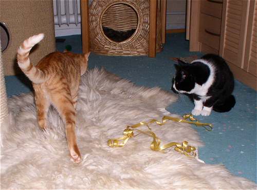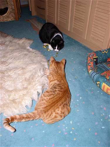 Ich bin wirklich sooo stolz auf meine kleine Maus! Sie zeigt überhaupt keine Angst vor Jerez und läuft direkt an ihm vorbei, natürlich mit dem obligatorischen kleinen, wohl eher halbherzigen Faucher .... aber wenn ich überlege, was sie bei Paulchen abgezogen hat und sich wochenlang auf dem Bett und sonstwo verkrochen hat ... Respekt, Respekt! Da kann man mal sehen, wie unberechenbar unsere lieben Fellnasen doch sind :-) |