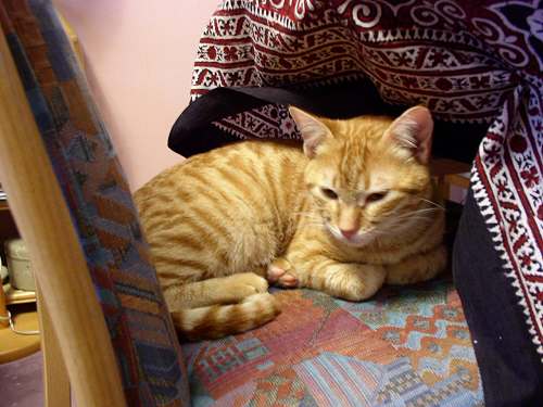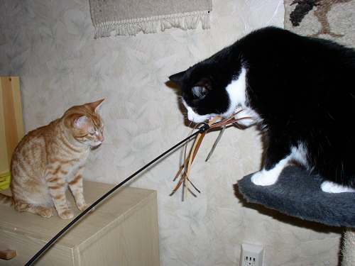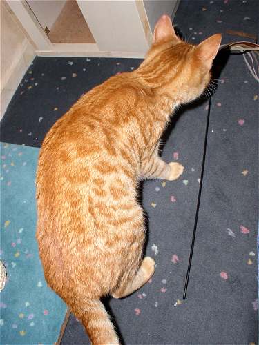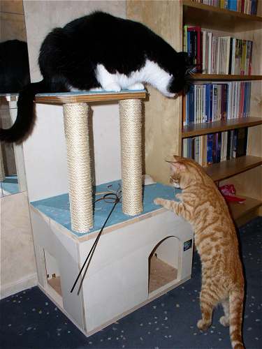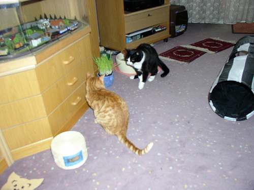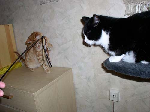 Na, das ist doch mal ein kleiner Schritt in die richtige Richtung :-) Wenig später im Flur hat Mäuschen den Kleinen allerdings doch wieder angefaucht ... ... das wird auch noch ne Weile dauern, bis das Thema durch ist ... jetzt malträtiert Jerez die Tchibo-Sisaltrommel (hurra, endlich spielt mal einer damit ), Paulchen sitzt knapp daneben und guckt zu und Mäuschen sitzt hier im Schlafzimmer und besieht sich die Sache von weitem. Kinders ... ich bin so häppi, dass es so gut läuft, gerade mit meiner kleinen Missis hatte ich mir schon die schlimmsten Szenarien ausgemalt . Fotos
