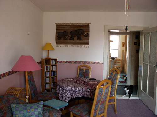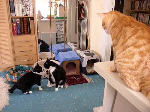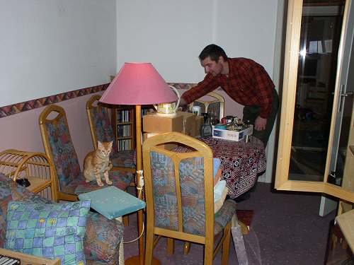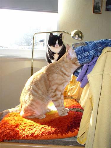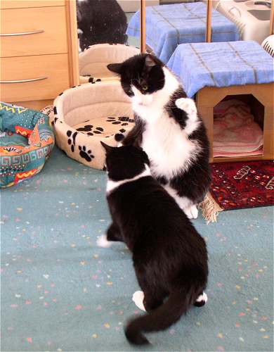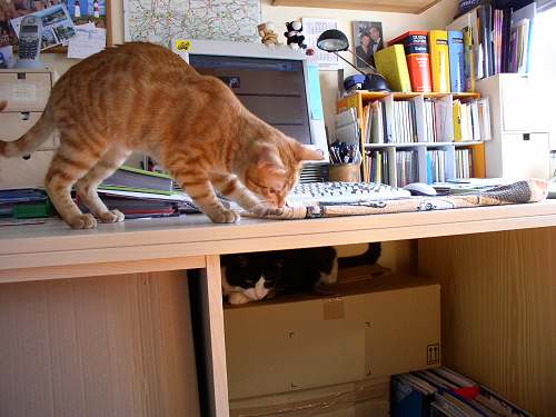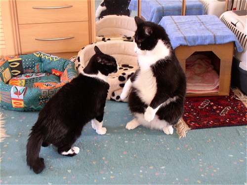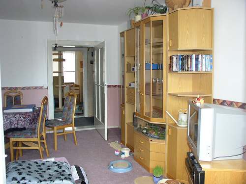 | Chaos pur ... ich bin nicht schuld! Hallo Leute, hier ist Jerez! Also ich muss Euch maunzen, hier ist vielleicht was los ![]() Schon seit Tagen hat Frauchen ja rumgeräumt und gemacht und getan, daraus wurde keiner schlau ... Heute sind die ganzen Bilder von den Wänden verschwunden! ![]() Paulchen kanns auch kaum fassen! ![]() Der Dicke hat seinen Frust an Mäuschen ausgelassen ... ![]() ... aber die lässt sich nix bieten! ![]() Hu! Ha! Karateeee! ![]() Wenn zwei sich streiten, freut sich der Dritte ![]() ![]() Platz ist in der kleinsten Hütte - Paulchen unterm Schreibtisch! ![]() Hier wurde soviel rumgeräumt ... muss doch mal gucken, was in der Hose ist! ![]() Paulchen ... bist Du noch da??? ![]() Tja und dann fingen die Dosis mit Möbelrücken an ... so sahs vorher aus ... ![]() ... dann gabs plötzlich einen neuen Gang an der Wand! Huhu Flori-Cat, mit dem Kabelsalat können wir Euch locker Konkurrenz machen ![]() Der Kram aus der Vitrine auf dem Tisch, in Kartons verpackt ... ![]() Ich find das alles wahnsinnig spannend! ![]() Zum Schluss stand alles in der Mitte ... ![]() ![]() Aber ......... im Schlafzimmer haben wir jetzt einen Kletterbaumwald! ![]() Mäuschen erkundet die Situation als erste. ![]() Komisch ist nur, dass jetzt die Wohnzimmertür zu ist Morgen soll nun ein Maler kommen ... ob wir helfen dürfen? Maunzige Grüßle aus einem chaotischen Haushalt, Eurer Jerez |