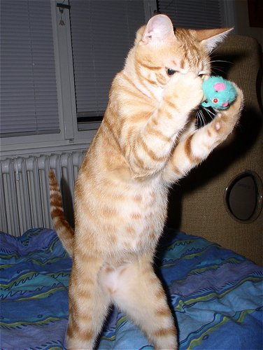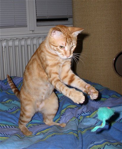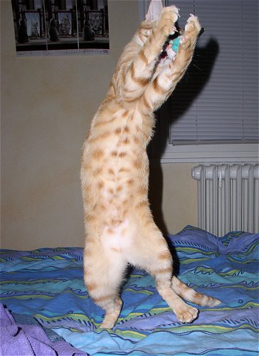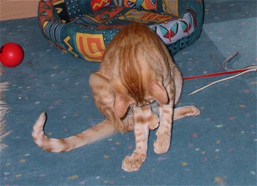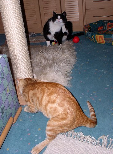 | @ Tibbs - Mit mir müsst Ihr rechnen! Hola, hier ist Jerez! Angestachelt durch Paulchens große Klappe, es unbedingt Tibbs zeigen zu müssen ... blieb die Hauptarbeit dann mal wieder an mir hängen Na gut, ich bin ja zu jeder Schandtat bereit ... ich such schon mal das Fangobjekt, während Paulchen noch über der Taktik brütet. ![]() Aber erstmal richtig putzen ... Kater muss doch gut aussehen!!! ![]() Der Cheftrainer bezieht seinen Posten! ![]() Und los gehts! Wie gut, dass Frauchen heute genügend Wurfelemente mitgebracht hat von der Katzenausstellung. ![]() Olé! ![]() ![]() Jaaaa! Na, was meint Ihr, ich bin doch mindestens so gut wie Tibbs??? ![]() Sportliche Grüßle Euer Jerez |