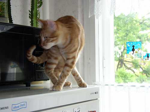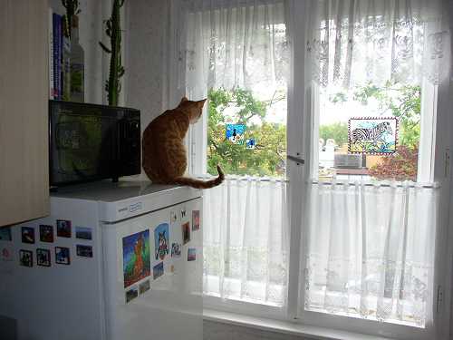 Reihe (Folge II) Bei uns in Berlin ist ja momentan das Turnfest, alle Schüler haben frei und in den Sportzentren steppt der Bär. So auch bei mir gegenüber - heute ist Fête angesagt. Radio brauch ich heute wirklich nicht, dafür vibirieren die Fensterscheiben und hüpfen die Gläser im Schrank im Takt der Bässe Jerez findet das aber ganz spannend! Natürlich ist auf der Straße auch entsprechendes Gewusel ... da muss man doch mal gucken! Hier auf dem beliebten Spanner-Kühlschrank ![]() ![]() Bis ihm das Gedröhne aber auch zu dumm wurde und er lieber das Weite suchte ... man beachte die elegante Fußstellung ![]() |