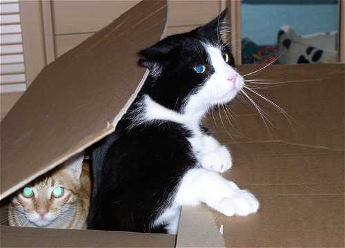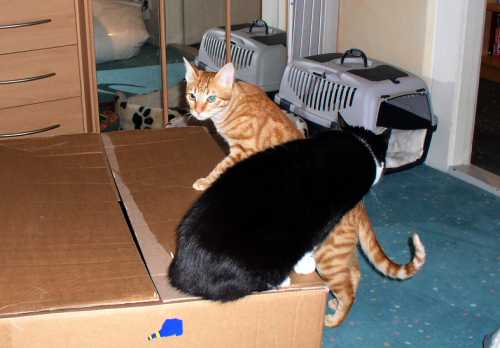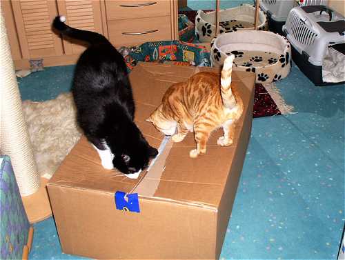 Schon beim Reintragen wurde ich neugierig empfangen. Das Klebeband hatte sich schon etwas gelockert und Jerez versuchte, seinen Kopf durchzuzwängen. Ich habe dann aber lieber "richtig" ausgepackt und hatte natürlich Hilfe Ohhh ... ist da was für uns drin??? ![]() Auch Mäuschen kam gucken, hüpfte aber schnell wieder von dannen, als Jerez die Bildfläche betrat. ![]() Die Jungs haben dann noch im leeren Karton gespielt. ![]() Leider musste ich die Kiste