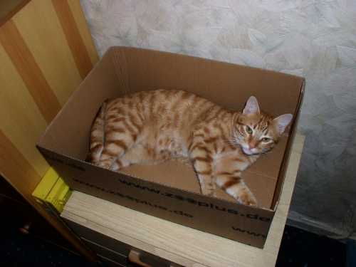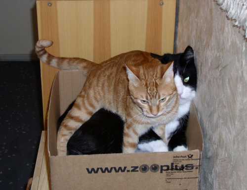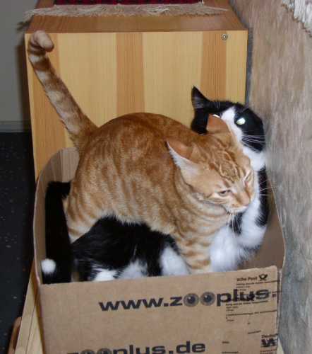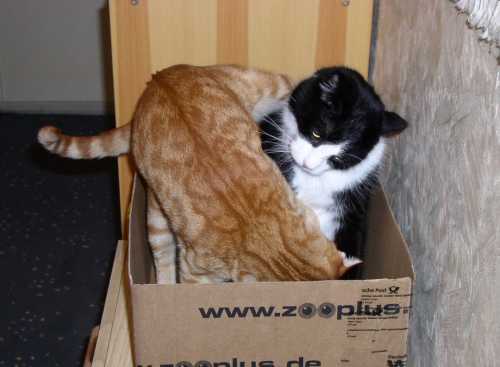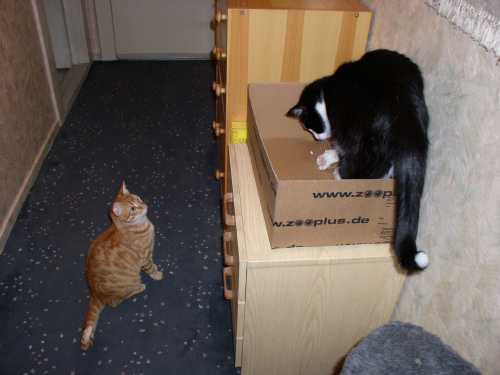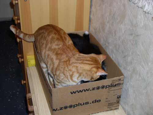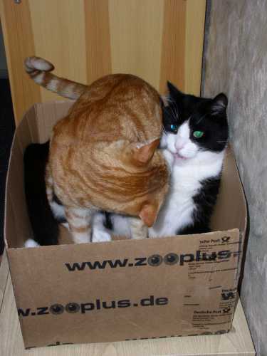 Als Frauchen alles weggeräumt hatte, haben wir natürlich die Kiste beschlagnahmt Guck mal Paulchen, da oben .... ![]() Der Dicke muss natürlich gleich mal gucken gehen. ![]() Jetzt lass mich aber auch mal mit rein ... ![]() Mach Dich nicht noch dicker, als Du bist! ![]() *drängel.....drück* ![]() *quetsch* .... *ächz* ![]() Mein Gott, bist Du stur, Paulchen! ![]() Na also, geht doch! ![]() ![]() Und wer gibt unserer Dosine jetzt seine Adresse, damit sie mich verschicken kann? Muchas Maunzos, Euer Jerez |