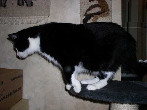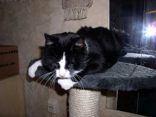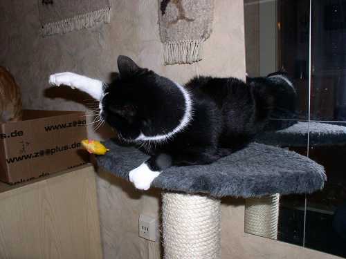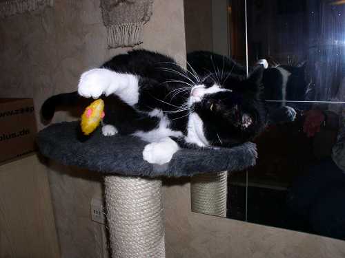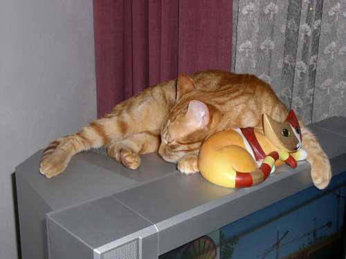 Und Jerez guckt zwar auch ganz erstaunt, was das sonst so ruhige Mäuschen da abzieht, zieht es aber selber vor, eine Runde auf dem Fernseher zu dösen: