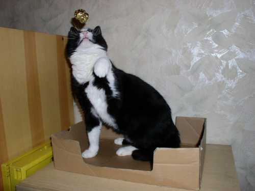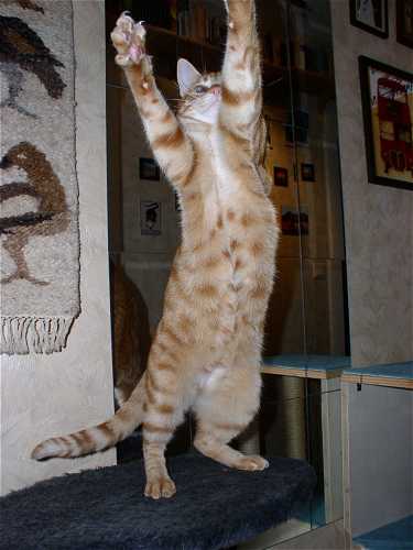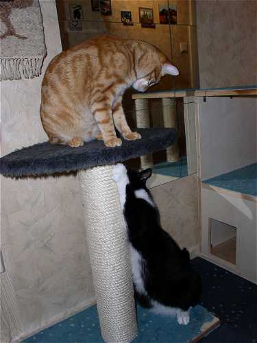 einfach zu verblüfft .... Ich erkenne mein Mäuschen kaum wieder ![]() * * * * * * Leider habe ich Mäuschens wilde Hatz mit Paulchen heute morgen ja nicht fotografieren können - die beiden waren heute morgen einfach zu schnell. Aber dafür habe ich ein paar schöne Bilder von unserer Spielstunde heute Abend gemacht: Wasn da oben los??? Lass mich mal gucken, Kleiner! Ooooh ... Mäuschen vor, noch ein Tor! Jerez muss natürlich gleich wieder gegenhalten: Ich kann das aber besser! Oller Angeber |