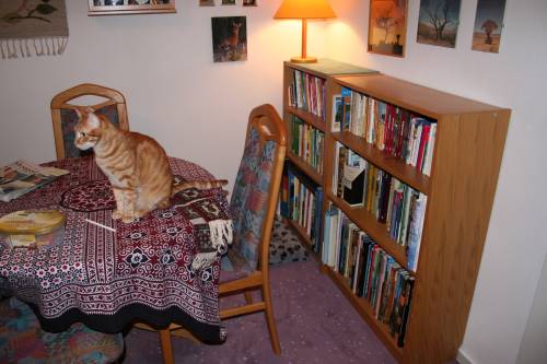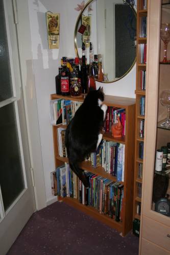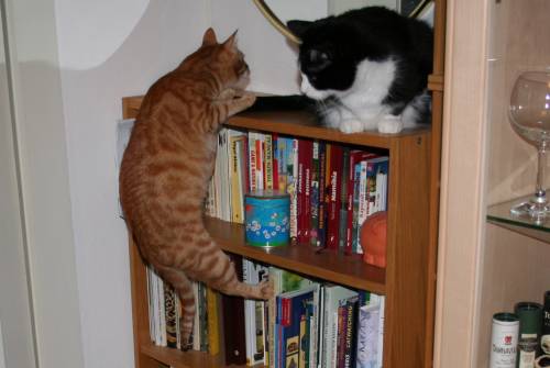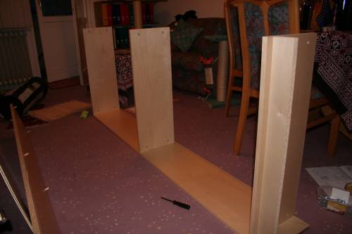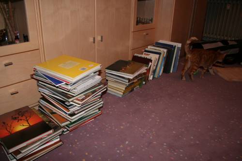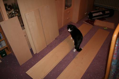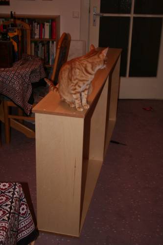 eine junge Frau und half mir, das Teil auf den Wagen zu wuchten. Wenig später im Parkhaus stand ich vor einem ähnlichen Problem, aber nu is man, äh frau, ja nicht dumm, und so habe ich das Paket kurzerhand ausgepackt und die Einzelteile ins Auto verfrachtet. Die 2 m langen Bretter ragten durch die Vordersitze hindurch - gut, dass Thomas nicht dabei war, der hätte sich ganz schön dünne machen müssen Zu Hause bin ich dann dreimal gelaufen, ehe ich alles oben hatte .... jetzt ist erstmal Verschnaufen angesagt und dann werde ich mich mit tat(zen)kräftiger Hilfe dran machen, das Regal aufzubauen! Bis später also, Fortsetzung folgt! * * * So, Billy steht. Nun muss ich nur noch den Kippschutz an die Wand schrauben (Dübel in Wand versenken) und das Regal ausloten .... Jerez habe ich übrigens in der Phase "Rückwandplatte einschieben" ausgesperrt, nachdem er auf die lose Wand hüpfte und diese unter seinen zierlichen 4 kg zerbrach ![]() Weiter gehts ... noch schnell Lärm machen * * * So, hier nun also der Beweis, dass wir heute Nachmittag richtig fleißig waren Phase I - Wundern über plötzliche Betriebsamkeit Da geschieht etwas *guck* ![]() Phase II - Ausräumen des alten Regals Natürlich mit tatzenkräftiger Hilfe .... ![]() Warte, ich auch ..... ![]() Ich habe viel zu viele Bücher ![]() ![]() Phase III - Umbau des alten Regals ![]() Phase IV - Die Orientierung ![]() Möchte man tatsächlich alle Ikea-Einzelteile (Schrauben, Nippel usw.) selber benutzen wollen, sollte man diese während der Bauphase in eine verschließbare Dose tun .... ![]() Phase V - Materialtest ![]() Der Katzentüv sagt: Daf Holfz ift ftabil genug ... Phase VI - Der Zusammenbau, auch: Kampf um die Schräubchen ![]() ![]() Danach flog Jerez dann raus aus dem Wohnzimmer, da er auf die Rückwand sprang, ehe diese fixiert war und prompt anbrach Zum Glück sieht man das