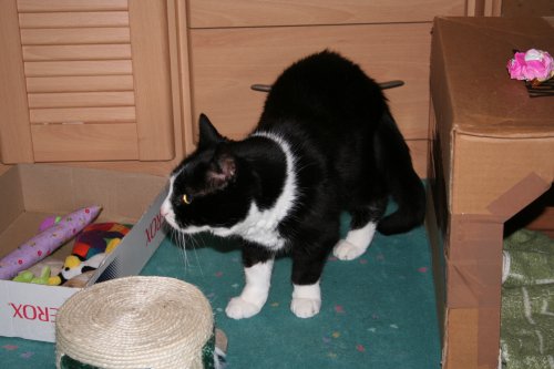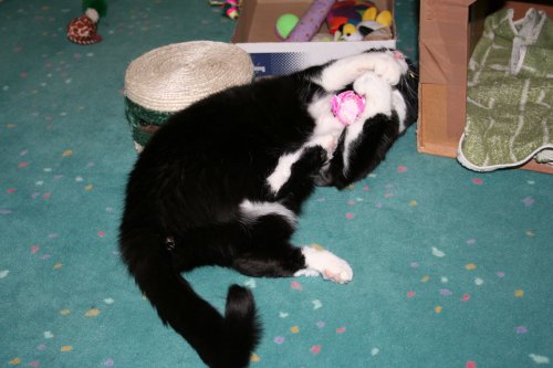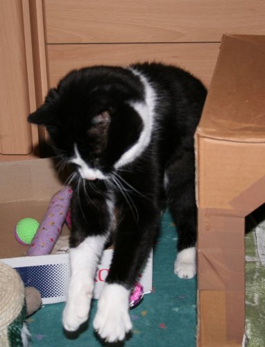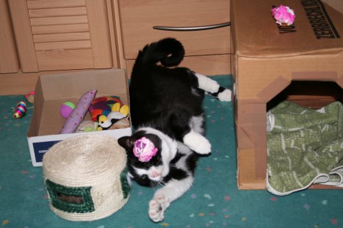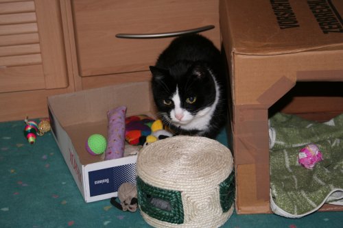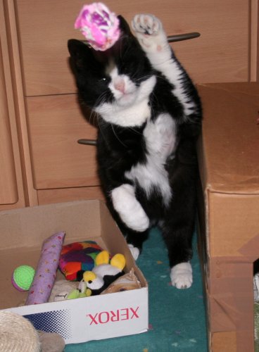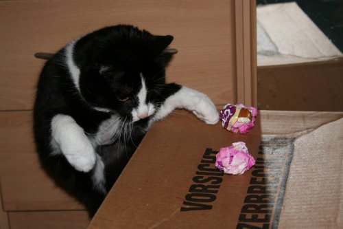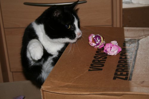 Also eben dachte ich, ich guck nicht richtig .... da hockt Mäuschen doch hinter dem Karton und belauert ihr Lieblingsbällchen .... und fängt an zu spielen ![]() ![]() ![]() ![]() ![]() ![]() ![]() ![]() Die richtig tollen Sprünge hab ich leider nicht raufgekommen. Mein Mäuschen ... ich glaub, die läuft sich für unseren Besuch warm |