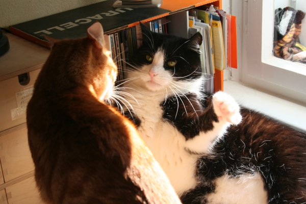 Den Katern gehts gut und eine Rauferei ist immer drin, auch gern auf dem Schreibtisch ![]() ![]() Mäuschen pflegt ihr Prinzessinen- und Missis-Image ![]() Kuscheln mit ihrem besonderen Freund Thomas (oder: wie wickelt man einen Katzenmuffel um die Pfote ![]() Im neuen Turm, friedlich vereint. Nur Jerez war sauer, weil er keinen Platz mehr fand ![]() ![]() Jerez und sein Lieblingsfeind, der Staubsauger (das graue Teil hinterm Türrahmen). Sonst hat er Schiss vor dem Monster, aber hier wird er wagemutig und stupst das rotierende Rad an ... *ditsch* ![]() Unsinn? Wir??? Niemals!!! ![]() ![]() |