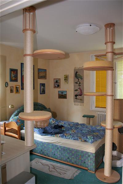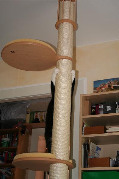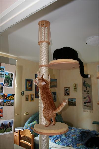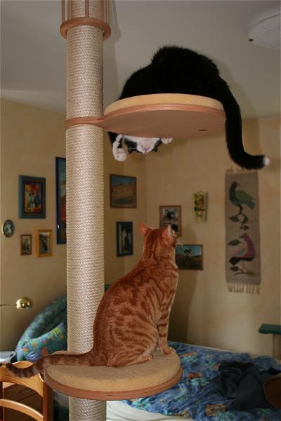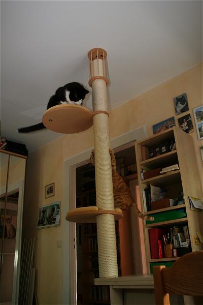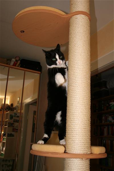 zufrieden.Das ist der Blick aus meinem Bett hoch. ![]() Sie können jetzt von Baum zu Baum hüpfen. Die Idee hierzu kam mir, als ich während der WoZi-Renovierung den anderen Baum am Schreibtisch stehen hatte ... Thomas meinte damals schon, "lass ihn doch einfach stehen und kauf Dir im WoZi einen neuen" Keine Sorge, ich komme unter den oberen Plattformen noch bequem drunter durch und stoße mir nicht den Kopf. Für größere Personen wirds allerdings eng Unten ist der Baum natürlich per Gewindestange im Schreibtisch verankert, damit er nicht weg kann, und mit Anti-Rutschmatte gegen Drehen gesichert. Die Kater haben den Baum also schon gut eingeweiht und Mäuschen wird sicher auch noch gucken kommen. Nachtrag: Mäuschen guckt ![]() |