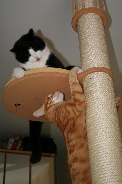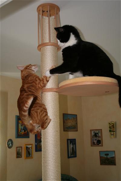 So, hier kommen nun die Bilder vom neuen Baum! Ja, ich gebe zu, ich bin verrückt, aber sind wir nicht alle ein bisschen gaga? Man schaut vom Flur ins Schlafzimmer - rechts der "alte" Baum und die Tonne und links auf dem Schreibtisch der neue! ![]() Erstbesteigung durch Paulchen ![]() ![]() Klasse - meint Paulchen, und Jerez will auch mal gucken. ![]() Das ist mein Baum, Du bleibst unten *ditsch* ![]() Mama, ich will auch gucken ![]() ![]() Nix da ![]() ![]() ![]() ![]() Zum Glück haben wir ja noch einen Baum gleich nebenan und so sind alle wieder