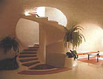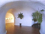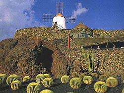 die an diesem Tage durch die Vulkanlandschaft fahren. Von Eseln und anderen Urlaubern Im Nordwesten Lanzarotes, direkt anschließend an den Parque Nacional de Timanfaya, wird das Vulkanland landwirtschaftlich genutzt. Schwarzer, geharkt wirkender Picon bedeckt die mit kleinen Steinmauern begrenzten Felder. Dieser Picon hat die Eigenschaft, die Feuchtigkeit der Nacht und den Morgentau zu speichern und an die Pflanzen abzugeben. Rings um Tinajo, Tiagua und Sóo wachsen Kartoffeln, Zwiebeln und anderes auf den schwarzen Feldern.Wir hatten einen Abstecher nach La Santa gemacht, wo auf einer Halbinsel umgeben von starkumbrandeter Lavaküste ein riesiges Sporthotel steht. Es gibt einen eigenen kleinen Surf-See und zahlreiche Tennis- und Sportplätze. Verschiedene Nationalmannschaften sollen hier ins Trainingslager gehen, immer wieder sieht man sportliche Radfahrer über die Straßen zischen. Der Ort La Santa, der kurz vor diesem Komplex liegt, bietet kaum etwas für Touristen, wohl aber einige Baustellen! Aus dieser erbauten Einöde kommend, fahren wir nun über die Felder, auf denen zartes Grün sprießt. Auf einem Acker erblicken wir einen einzelnen Bauern, der seinen Esel dabei hat, der geduldig auf seinen Herrn wartet und dessen Utensilien auf dem Rücken trägt. Welch ein Kontrast läßt sich innerhalb weniger Kilometer und Minuten erleben! Wir fahren weiter über Sóo nach La Caleta, einem kleinen Fischerdorf unterhalb des Risco de Famara. Im Restaurante El Risco sprüht die Gischt der Brandung an die Fensterscheiben. Hier esse ich Gambas al Ajo, Krabben, die in Knoblauchöl schwimmen. Sehr lecker, aber immer auch sehr heiß. Ein Stück hinter La Caleta liegt der Playa Famara, ein schöner breiter Strand, wo das Baden jedoch nicht ungefährlich wegen der Brandung ist. Aber man kann gut in den Wellen des flachen Ufers herumhüpfen, wenn man sich nicht vor den zahlreichen glibberigen Algen ekelt! Es war lustig, als Carola und ich hier lagen und uns sonnten: Schien da nicht das Meer immer näher an unsere Handtücher am Rande des Strandes zu schwappen? Und siehe da, plötzlich mußten unsere nächsten Nachbarn, die ca. 100m von uns entfernt in einer Mulde lagen, aufspringen und vor der aufkommenden Flut flüchten! Wir hatten genügend Zeit, unsere Siebensachen zusammen zu raffen und dann in aller Ruhe den Heimweg anzutreten. Nicht nur in den zahlreichen Sehenswürdigkeiten der Insel wird man mit den Werken César Manriques konfrontiert. In der Nähe von Tahiche befindet sich die Fundaçion César Manrique. Dieses Haus hat der Künstler jahrelang selbst bewohnt und dann der Öffentlichkeit als Museum gestiftet. Er selbst hat bis zu seinem Tode in Haria gelebt.Bereits im umgebenden Garten sind