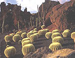 Weinanbau und Bodegas rund um La Geria Etwa in der geographischen Mitte Lanzarotes befindet sich das Gebiet von La Geria. Hier wurde im 18. Jahrhundert von Menschenhand eine einzigartige Landschaft geschaffen. Da die Insel hier von vulkanischen Auswürfen bedeckt ist, hoben die Bauern tiefe Trichter aus, in die sie die Weinpflanzen oder Feigenbäume setzten.![]() An der Straße zwischen San Bartholomé und Uga liegen einige Bodegas, in denen man unverbindlich die Weine der Gegend kosten kann. Natürlich sind diese Probierstübchen auf ganze Busladungen von Kunden eingestellt, doch wir paßten es immer so ab, alleine dort hinein zu gehen und so in Ruhe die "Degustation" zu genießen. So erstehen wir einige Flaschen lecker schmeckender Weine von El Campesino bei Masdache, während uns in der nächsten Bodega der Wein wie Essigwasser vorkommt. Die Bodega El Grifo treffen wir leider nur im geschlossenen Zustand an, diese Weine kennen wir aus dem Supermarkt, sie fallen zuerst wegen ihrem künstlerisch gestalteten Etikett auf. Eine Probe des Malvasia semiseco oder seco (wobei der "halbtrockene" eher lieblich und der "trockene" eher halbtrocken ist) überzeugt uns von der Qualität der Weine und wir erklären "El Grifo" zu unserer Lieblingsmarke. Auch der Rosado mundet uns vorzüglich, während wir beim Rotwein lieber auf "Sangre de Toro" vom spanischen Festland zurückgreifen. Der Vollständigkeit halber seien hier noch die Weine der Bodegas Mozaga und der Vino La Era erwähnt, die jedoch in unseren Gläsern keine weitere Rolle spielten... Man kann das Weingebiet auf der Hauptstraße von Mozaga über Masdache, Testeina und La Geria bis nach Uga der Länge nach bequem auf gutasphaltierter Hauptstraße durchqueren, auch den einen oder anderen Stop zum Fotografieren einlegen, doch reizten mich wieder einmal die kleinen Straßen querfeldein, die ab und zu aus den Weinbergen auf die Hauptstraße stießen. So schlage ich eines Tages, als wir von Puerto del Carmen zurückfahren, in Mácher die Straße nach La Asomada ein und zweige dort in ein zwar eingezeichnetes, aber recht dünnes Sträßchen ein, das laut Karte quer über die Vulkane und durch den Wein nach Uga führt. Man ist skeptisch, ob wir unser Ziel erreichen, denn hinter den Häusern hört der Asphalt auf und die Straße windet sich als Schotterpiste den Berg hinauf, doch es geht, und hinter dem Bergkamm schlängelt der Weg durch die Weintrichter bergabwärts. Es ist phantastisch, mitten durch diese bizarre Landwirtschaft zu fahren. Natürlich begegnet uns hier kein Mensch, der normale Tourist wird selten auf die Idee kommen, die ausgeschilderte Hauptstraße zu verlassen - darin liegt aber gerade der Reiz! Natürlich würde es mir nicht einfallen, gesperrte Privatstraßen zu befahren, doch wo nichts dran steht - vamos! sollte Puerto del Carmen als Urlaubsort wählen! Wir haben uns ja bewußt im ruhigeren Playa Blanca einquartiert, wollen uns den Haupt-Touristenort aber doch einmal ansehen und auch ein bißchen durch die Geschäfte bummeln. So parken wir unseren Wagen im Schatten des Hotel Los Fariones und laufen entlang der Hauptstraße an der Rückseite eines riesigen Gebäudes vorbei. Wenig später öffnet sich die rechte Seite zum Meer hin und der breite, wohlorganisierte Strand wird sichtbar. Ich nenne das mal so, denn die Liegen und Schirme stehen in Reih und Glied und nur wenige Urlauber haben sich "wild" niedergelassen. Wie mag es hier in der Hauptsaison im Sommer zugehen? Links der Straße reiht sich ein Geschäft an das nächste: Souvenirs, Strandzubehör, Parfüms, Schmuck, Zeitungen und Postkarten wechseln sich mit Autovermietern, Bars, Restaurants und Eisbuden ab, und sogar eine deutsche Bäckerei entdecken wir. Irgendwo, aber noch lange nicht am Ende dieser Promenade, drehen wir um und kehren in eines der zahlreichen Restaurants ein, wo wir einen Rieseneisbecher verzehren! In zweiter, dritter, vierter usw. Reihe liegen die zahlreichen Bungalowanlagen für die Gäste. Beim Rückweg zum Auto sind wir uns einig, daß es uns im kleinen und fast noch beschaulichen Playa Blanca besser gefällt! Ganz oben im Norden Lanzarotes, kurz vor dem "Ende" der Insel, liegt der Tropical Parque bei Guinate. Wieder haben wir auf der Hinfahrt die Wahl zwischen der "Straße der Vulkane" und der "Weinstraße". Beide sind immer wieder schön zu fahren! Der Tropical Parque liegt kurz hinter dem Örtchen Guinate an einer kleinen Stichstraße, die bis zu einem Aussichtspunkt in der Steilküste führt. Von diesem Mirador aus hat man einem tollen Blick hinunter aufs Meer, in die Felsen und hinüber bis La Graciosa. Doch das werden wir noch besser bekommen!Wir betreten den Parque, bezahlen unseren Eintritt und befinden uns in einem wunderschönen blühenden Garten mit vielen Volieren, in denen exotische Vögel hausen. In einem großen Freigelände kann man auf Tuchfühlung mit Pfauen, witzigen Punk-Hühnern und anderen gefiederten Viechern gehen. Bei meinem zweiten Besuch hier scheint die Sonne und so sehen wir, daß der Parque auf einem Sattel zwischen zwei Bergen liegt. Am oberen Ende des Geländes liegt ein großer Bungalow mit Imbißbude und Vorführraum für die Papageien-Show, die wir natürlich besuchen! Einige Aras und Kakadus sitzen hier auf ihren Stangen und warten auf ihren Auftritt. Ein Angestellter führt sie nun vor und läßt sie verschiedene Kunststückchen machen: Radfahren, Rollschuhlaufen, Basketball spielen und Stierkampf gehören ebenso zum Programm wie Intelligenztests, bei denen die Papageien Farben zuordnen oder Rechenaufgaben lösen müssen! Natürlich fallen den lustigen Vögeln immer wieder irgendwelche Dummheiten ein, mit denen sie uns als Publikum begeistern. Von Guinate